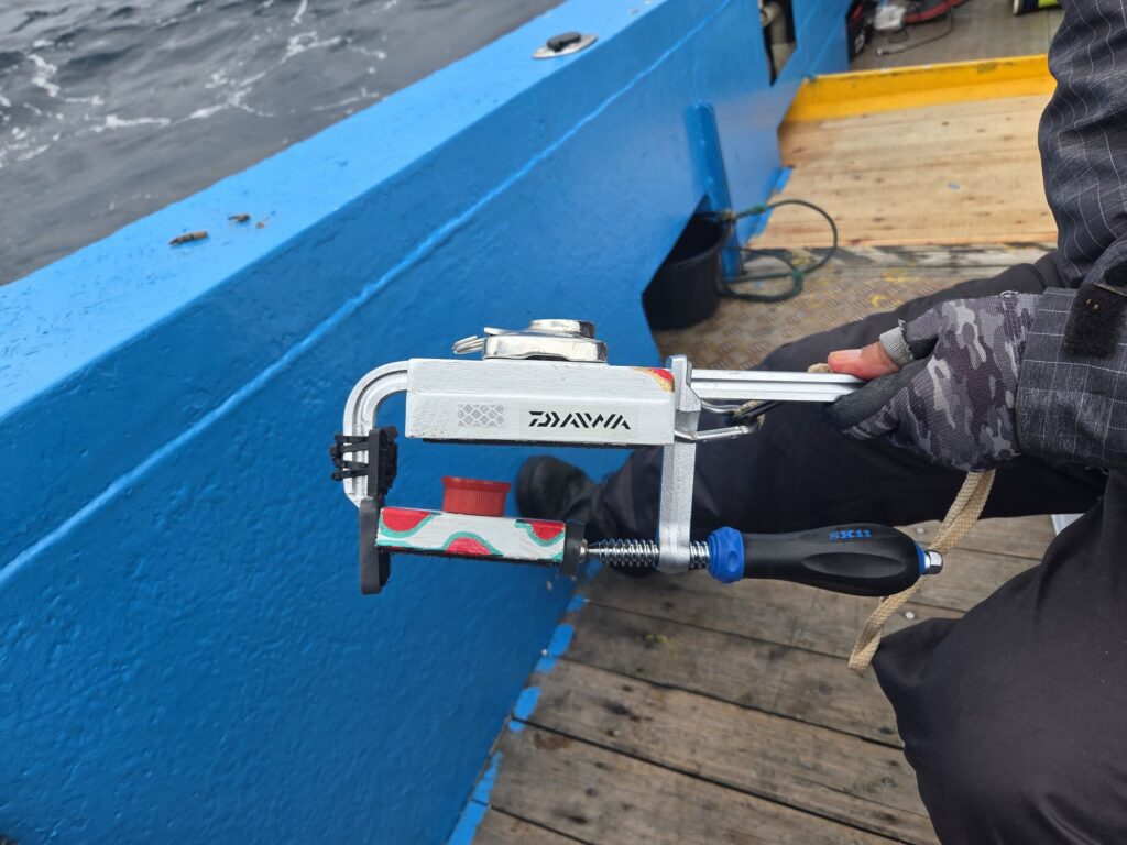 うちの船ではイカ釣りの釣り座にはラーク竿受けがありますが、タイラバやジギングの時は必要無い派ですのでつけられるようになっておりません。